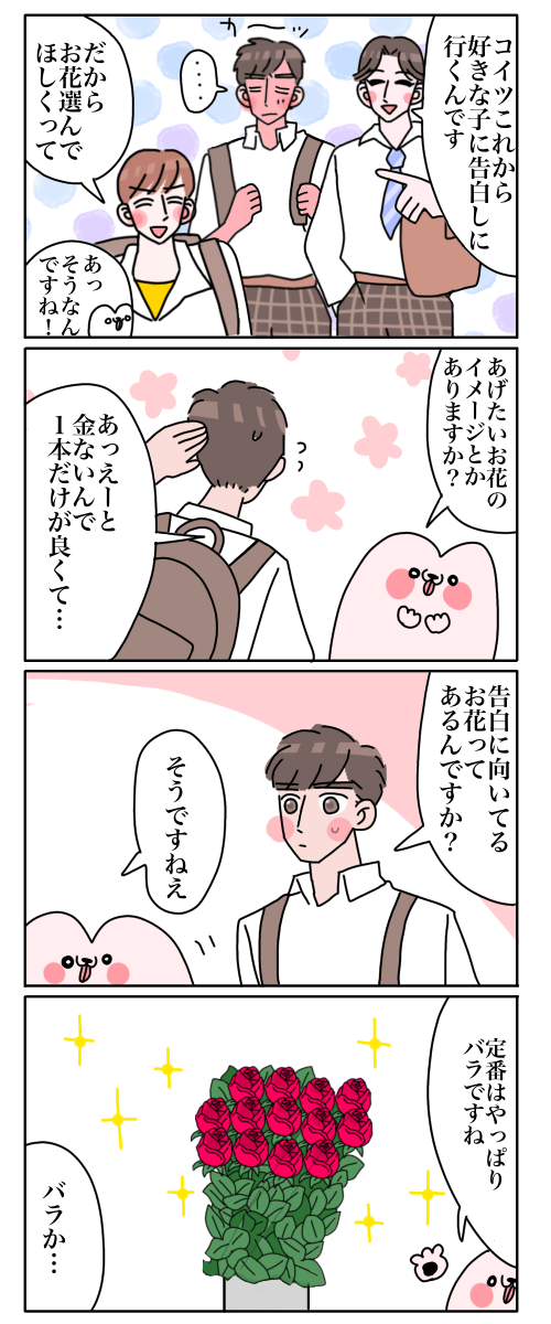 好きな子に告白する為に、3人で花を買いに来た男子高校生たちが可愛かった話② 2022年08月25日 キチジローの体験談です!※プライバシーの保護のため、所々にフェイク入れてます。初めから読みたい方はコチラ!👇 続く! 🌹🌹🌹🌹🌹🌹🌹🌹🌹🌹🌹🌹🌹🌹🌹🌹🌹🌹🌹🌹バラにはバラの切り花長持ち剤を使うと🌹◎ダリアやバラなど、茎が硬いものはナイフでナナメにカットしてあげましょう◎🌹🌹🌹🌹🌹🌹🌹🌹🌹🌹🌹🌹🌹🌹🌹🌹アプリでフォローするとブログの更新通知が届きます!↓【フォローの仕方】①ライブドアブログのアプリをダウンロード②アプリ内で「花」と検索🔍③「キチジローの花のおブログ」をフォローこれでOKです🌹✨ OFUSEで応援を送る < 前の記事次の記事 > コメント コメントフォーム 名前 コメント 記事の評価 リセット リセット 顔 星 情報を記憶 コメントを投稿する